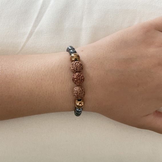 Rudraksha-Kerne sind nicht nur schön, sondern gelten auch als Augen des Hindugottes Shiva. In diesem Hämatit-Armband sind sie ein besonderer Hingucker.