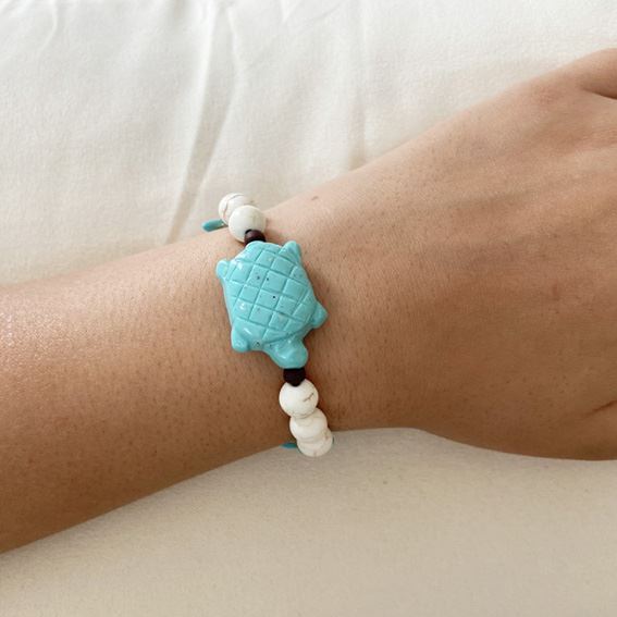 Am Strand wirst du mit diesem Armband zum Trendsetter. Griechische Keramik-Perlen und -Seesterne sowie eine Schildkröte aus Acryl lassen Urlaubsstimmung aufkommen